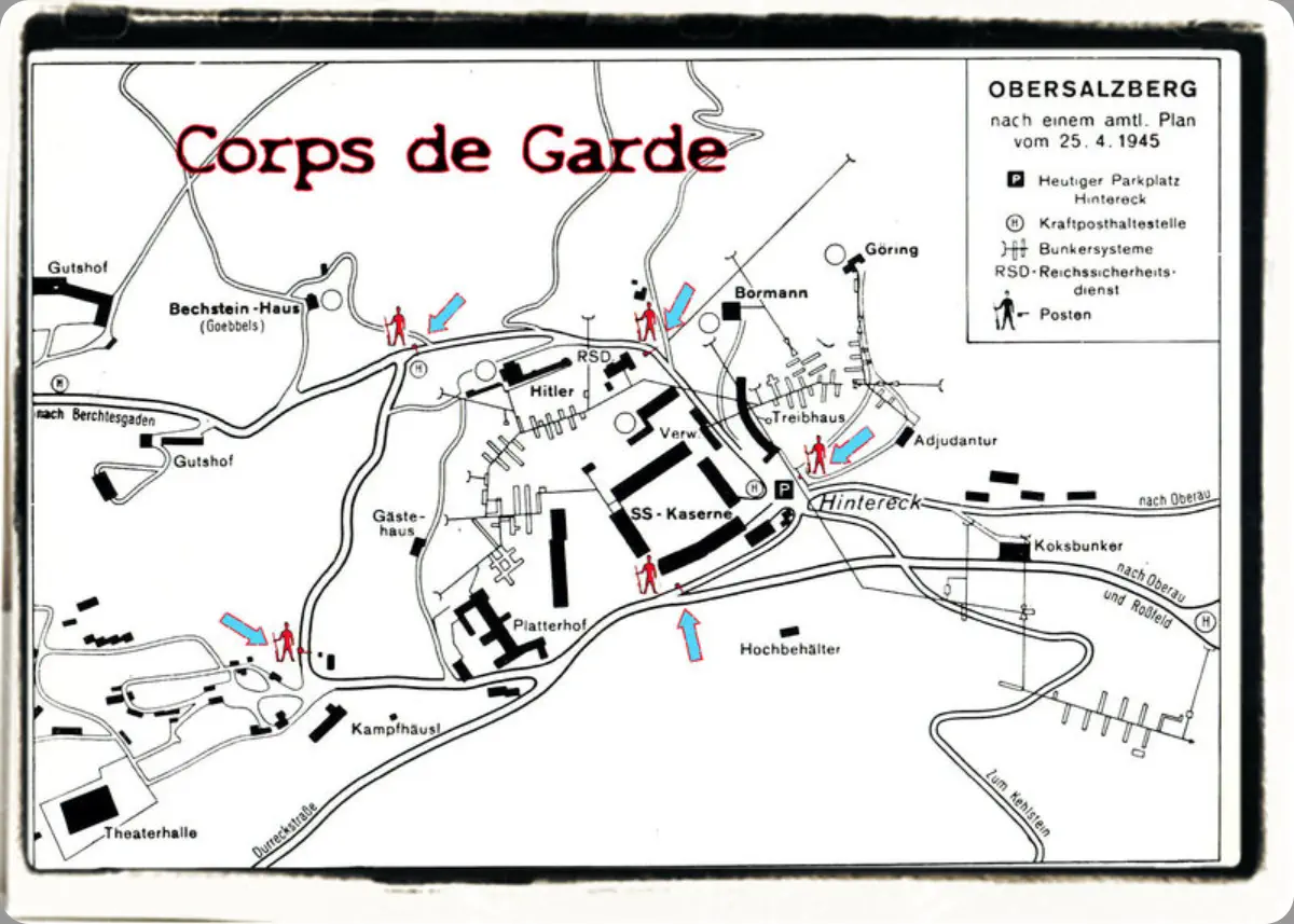 Il était très difficile de s'approcher du Berghof.Bientôt l'Obersalzberg ressemblait à une forteresse alpine.Pourlasécuritéetlatranquillitéd'Hitler,lesclôturesontétérenforcéesautourdesonchalet,périmètrequine cessera de s'étendre.Lepérimètre10km²étaitclôturéetgardésur27kilomètresauseinduquelles3kilomètresautourduBerghof étaient dénommés "zone réservée du Führer" (Führersperrgebiet).On dressa des barrages, et tous ceux qui habitaient et travaillaient dans la zone recevaient des laissez-passer. A l'entrée de la zone interdite, le dernier poste de garde. Les fondations sont encore visibles aujourd'hui.